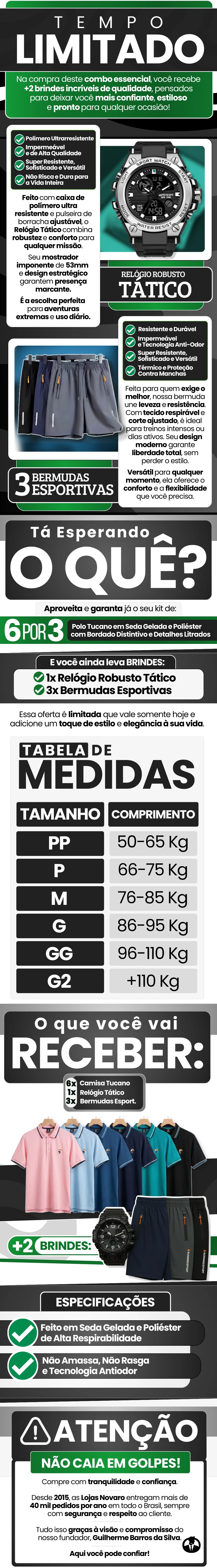 Essa Polo Tucano Masculina da Novaro não é moda passageira. É feita pra quem tem presença e entende de qualidade que dura. Com tecido Seda Gelada e poliéster de alta respirabilidade, ela mantém o frescor do dia inteiro enquanto você trabalha, curte o churrasco ou encara qualquer desafio. Exclusiva pra quem sabe o que é estilo de verdade.
