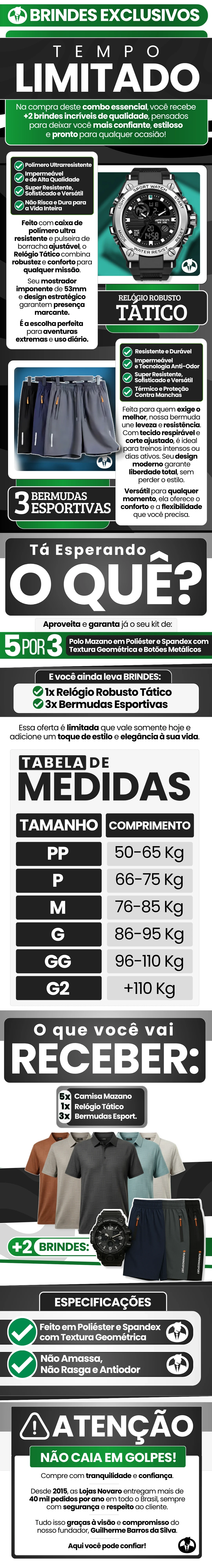 Não é camisa, é símbolo de presença. Com 92% Poliéster, 8% Elastano, a Polo Mazano veste quem valoriza legado, não moda. Aguenta rotina, calor e suor sem perder o respeito. Você veste e sente que faz parte do seleto grupo de homens que não abaixam a cabeça pra ninguém.