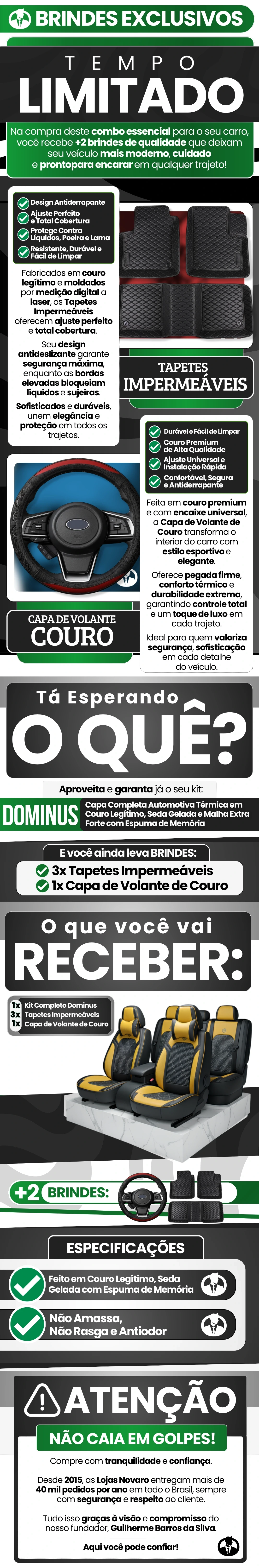 Cada costura reforçada, cada detalhe pensado pra aguentar uso bruto, seja no campo, cidade ou estrada. Não deforma, não esfarela, não solta nas beiradas. Produto feito pra durar anos, não meses. Homem que entende valoriza o que é verdadeiro. Pra quem quer respeito até no detalhe do banco.